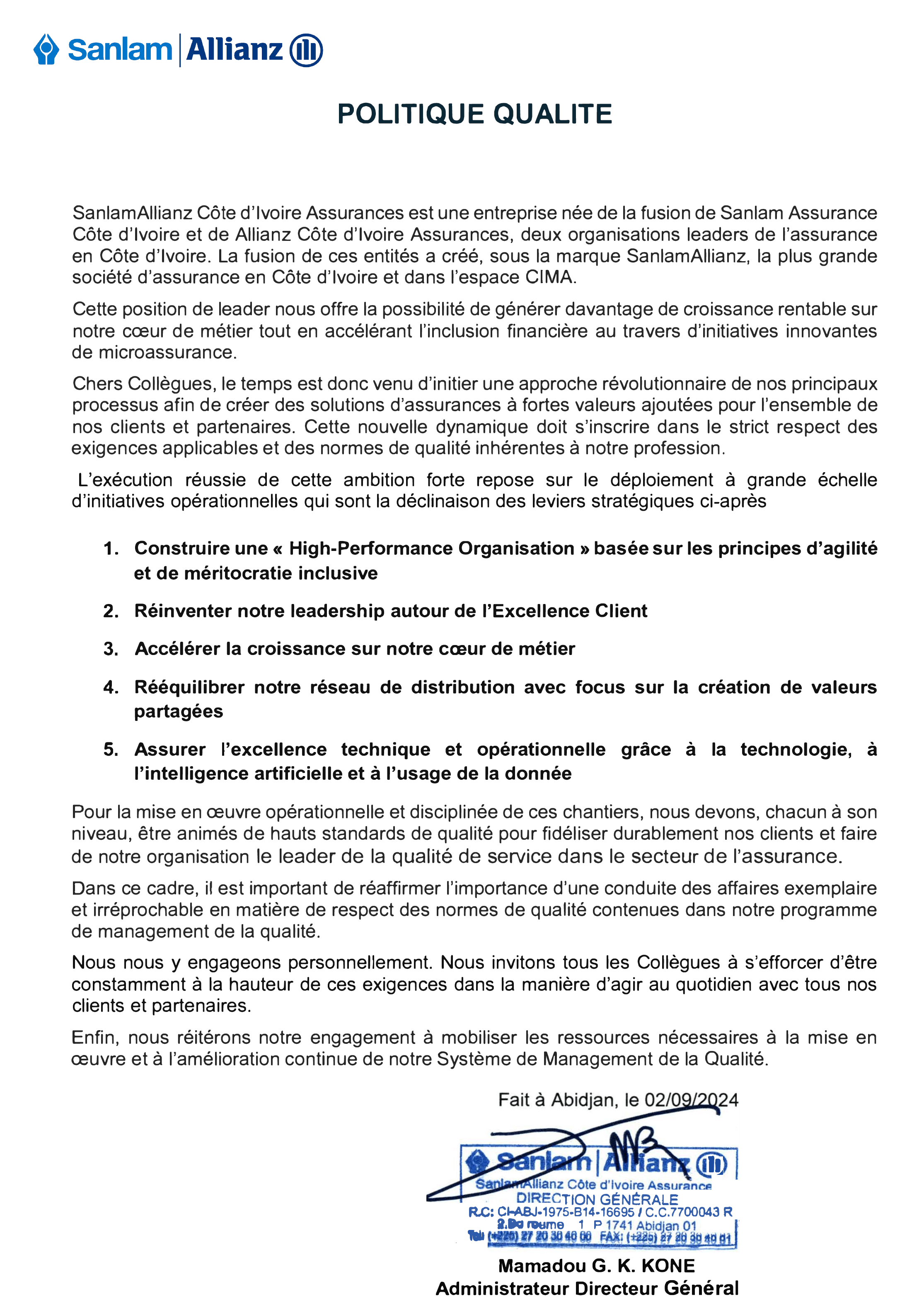 SanlamAllianz Côte d'Ivoire affirme son ambition de rester leader en assurance en misant sur l’innovation, l’excellence client et la qualité de service. Sa politique 2024 repose sur cinq axes : agilité, leadership centré client, croissance métier, réseau équilibré et technologie. Tous les collaborateurs sont engagés à respecter des standards élevés pour une amélioration continue du système qualité.